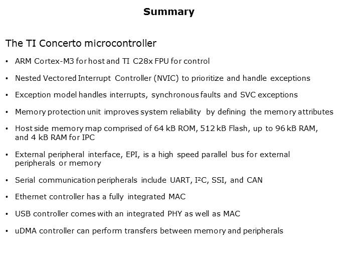 In summary, the Texas Instruments Concerto™ microcontroller is a dual core microcontroller based on a new system architecture for C2000, featuring an ARM Cortex™-M3 for host communication controls and a dedicated C2000 core and peripherals for the control type functions. The Cortex-M3 processor supports interrupts and system exceptions through the NVIC, which prioritizes and handles all the exceptions in this controller. To increase interrupt service, speed, and efficiency, a tail chaining model is used where the processor state is automatically stored to the stack on an exception and automatically restored from the stack at the end of the interrupt service routine. The memory protection unit improves system reliability by defining memory attributes such as no access, read/write, or read only for different memory regions. Concerto also features the external peripheral interface, EPI, which is a high speed parallel bus for external peripherals or memory. EPI is similar to a standard microprocessor address or data bus and has several modes of operation to interface to many types of external devices. The Concerto Ethernet controller has a fully integrated media access controller or MAC, but there is no network physical interface. Unlike the Ethernet portion, the USB does have the integrated physical layer, PHY, as well. The µDMA controller has a dedicated channel for each supported on-chip module and is used to perform transfers between memory and peripherals.